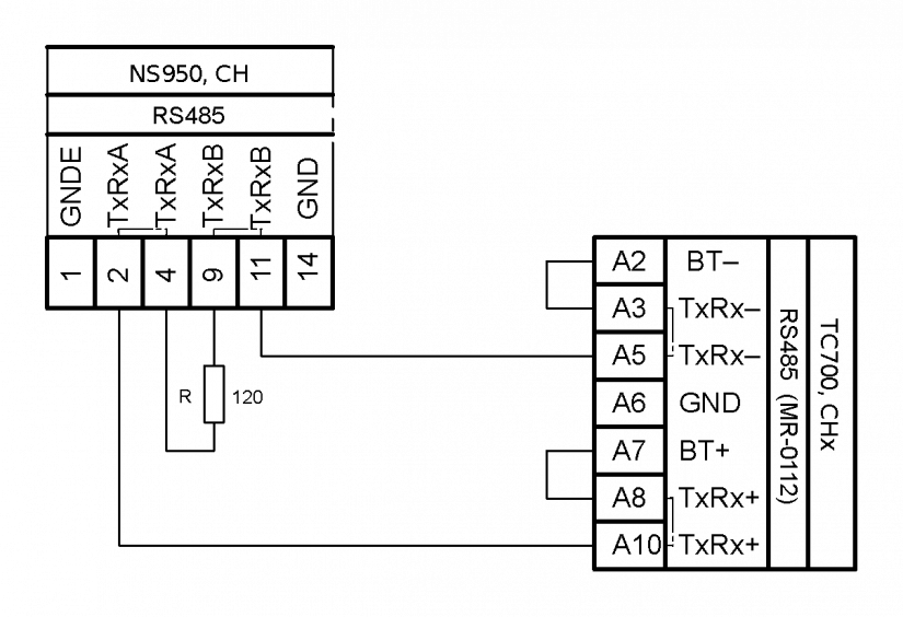 Propojení systémů TC700 a NS950 sériovým kanálem s rozhraním RS-485 je uvedeno na obr. 2. Zapojení předpokládá dva systémy a tudíž zakončení sběrnice je realizované na obou stranách. V případě propojení více systémů se zakončení připojí pouze na koncových systémech připojených na sběrnici.