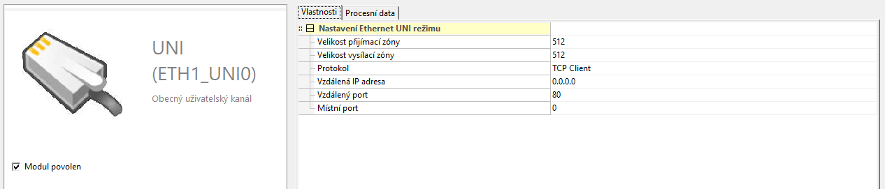 Pro komunikaci se využívá ethernetového rozhraní v PLC. Velikost přijímací i vysílací zóny je 512 bytů, protokol je nastaven na TCP Client a vzdálený port je 80.