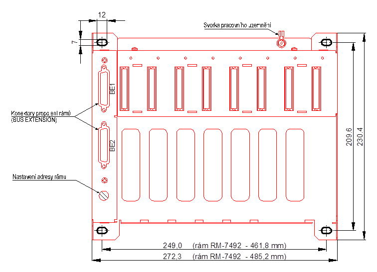 Obr. 1 uvádí základní mechanické rozměry rámu RM-7941 (8 pozic). Rám RM-7942 (15 pozic) se liší pouze délkou, která je na obrázku také uvedena. Celková hloubka systému (včetně modulů) je 138 mm.
