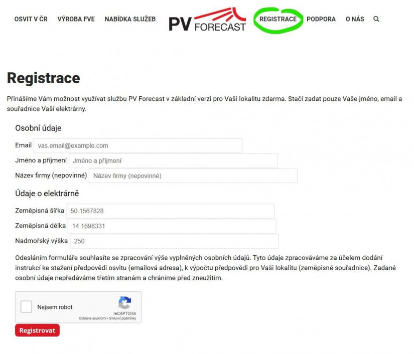 Pro používání služby je vyžadován unikátní klíč (key) vázaný na zeměpisné souřadnice zadané při registraci (lat, lon). Klíč je vygenerován po vyplnění registračního formuláře na webu www.pvforecast.cz v sekci Registrace a zaslán na zadaný email. Po přijetí emailu lze službu začít používat.