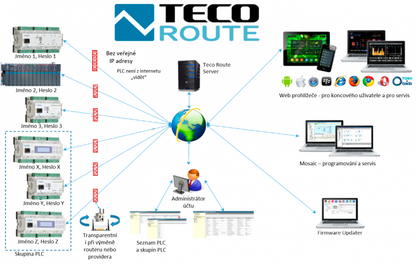 Teco has developed a unique TecoRoute communication service for access to an internal web server and user websites without a public IP address. It is unique in that it does not need any external device and it is enough with a SW solution to the problem within the firmware of its own PLC Tecomat, both in the Foxtrot series and in the TC700 series. To register each Tecomat PLC in the TecoRoute service, it is necessary to have an administrator account. It is mostly for society, but it can of course also be for individuals. Tecomat PLCs with a unique name and password for authorization are registered for this account on the one hand, and users with an authorization name and password are also registered on the other side. The account administrator then assigns access rights and roles of individual users to individual or group organized PLCs. The user then has the option of accessing user pages in Tecomat via a web browser, the programmer can have the right to access using the Mosaic programming environment or the right to manage the firmware via the Firmware updater.