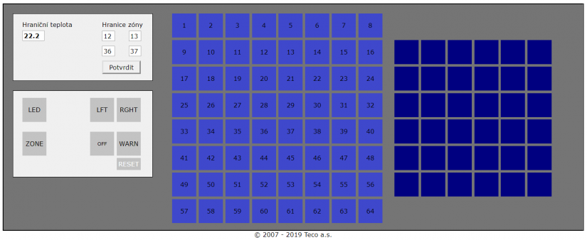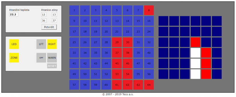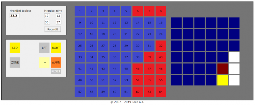 Možné teploty (vzhledem k možným výstupům a měření) byly rozděleny do několika intervalů, kterým byly přiděleny hodnoty 0 – 7, podle kterých byla nastavena barva segmentů (vícestavový obrázek) ve webovém rozhraní, které tvoří menší mapu napravo. Bílá značí nejteplejší, fialová nejchladnější. Jelikož jsem nenašel normu, barvy jsou pouze orientační. Tato mapa je pouze 6x6 (chybí okraje), jelikož by došlo k překročení možného počtu proměnných ve webovém rozhraní.