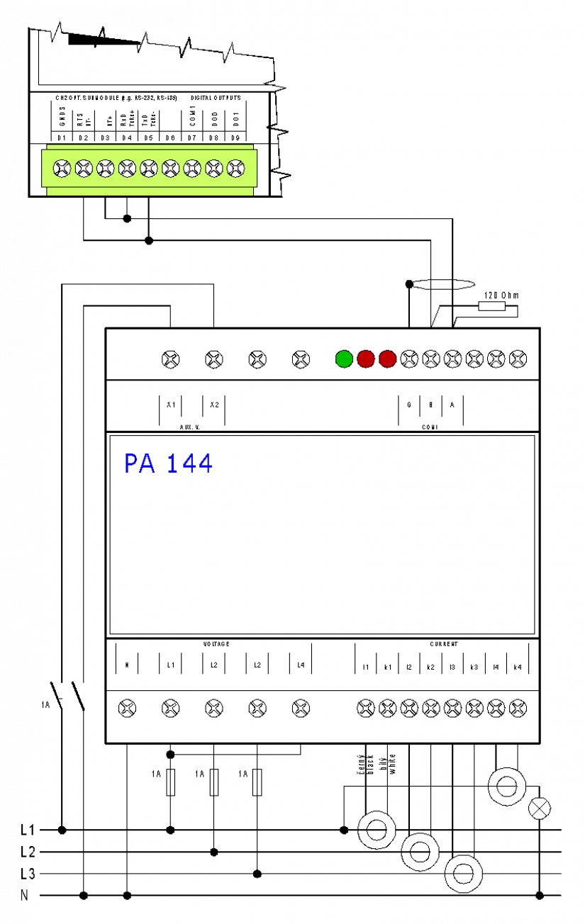Fig. 1 Example of 3f network measurement connection with PA 144 device connected to CH2 CP-10x6 (10x8)