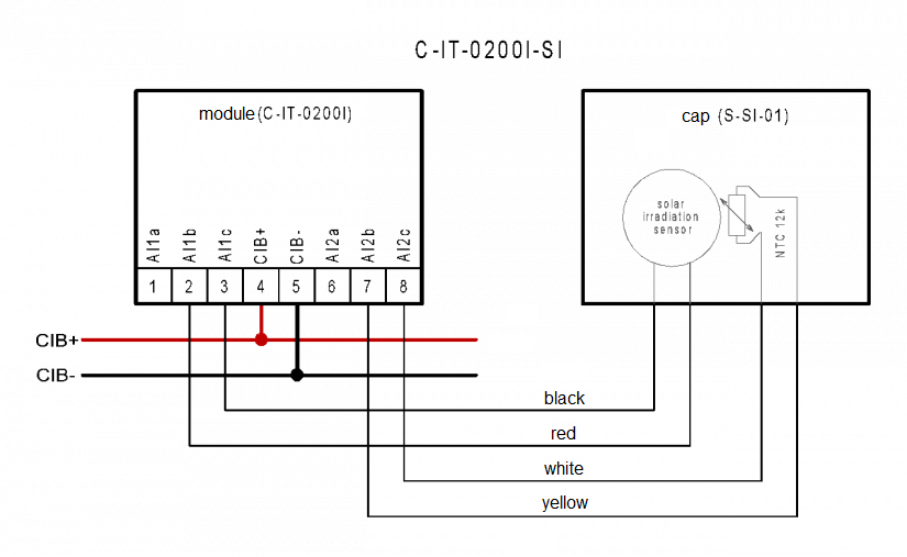 Measuring solar radiation can be done by the C-IT- 0200I-SI module, which comprises the inner part of the C-IT-0200I module fitted into the S-SI-01I sensor.