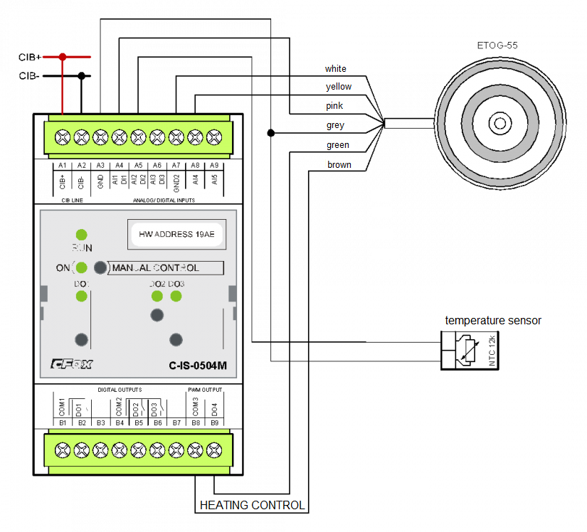 Heating of the ETOG-55 sensor has the power input of approx. 2.5 W at 24 V supply. Heating of the ETOG-55 sensor can be connected directly to the DO4 output of the C-IS-0504M module, which is primary intended to power the heating.If the heating of the ETOG-55 sensor is powered from another 24VDC source, it must be switched by other relay output within the system, e.g. by output on the C-IS-0504M module, to which the ETOG-55 sensors are also connected (max. 2 sensors per independent inputs of module) - see the following example of wiring.