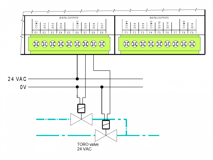 Controlling water for irrigation systems with the 24VAC TORO valves in the TPV series is shown in the following diagram. The wiring diagram illustrates the control of two valves by relay outputs of the CP-1006 basic module. The relay outputs of other modules can be used in the same way, e.g. the C-HM-0308M, etc. Thanks to the small initial and trickle currents, relay outputs fitted with a 5 A and 16 A contacts can be utilized for switching. If more than three valves are controlled by one 5 A relay output, a protective element should be fitted (a varistor, an RC member) in order to secure a long lifetime of the relay contact.