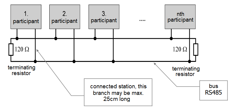 The line must maintain the character of the bus, i.e. the cable must always be routed from the station to the next station. If it is necessary to make a branch, its length must not exceed 25 cm (there must be no termination resistor on this branch!).