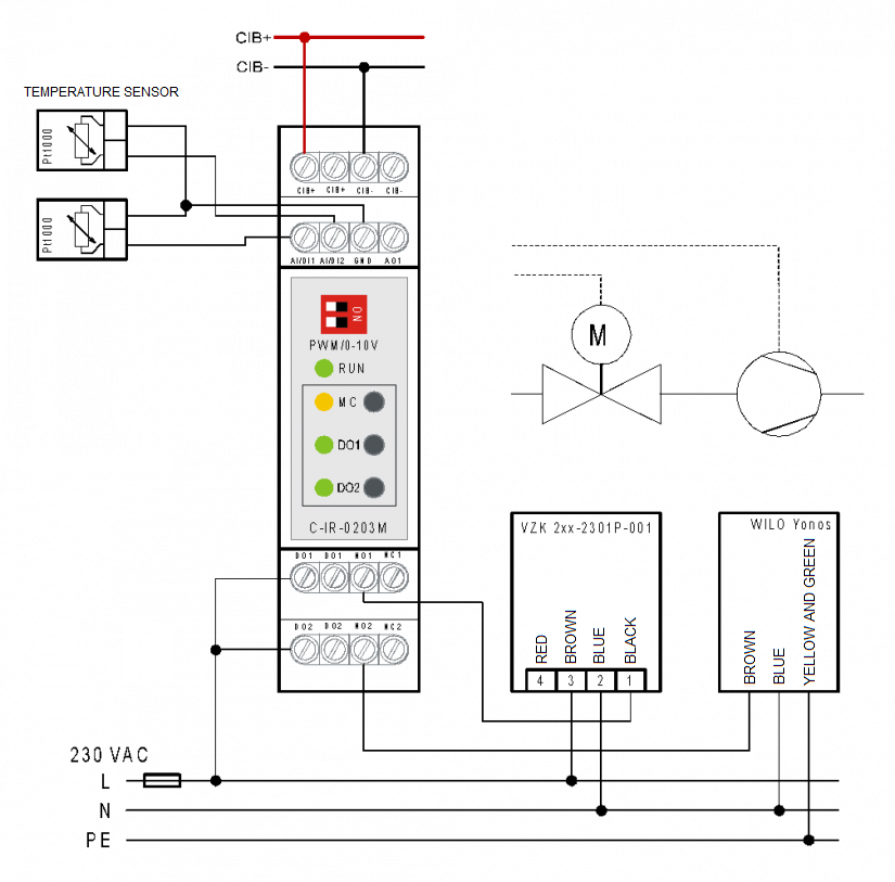 The following figure shows an example of electrical connection of the VZK 2xx - 230 - 1P – 001 zone valve produced by Regulus. It is controlled by the C-IR-0203M module together with the Wilo Yonos circulation pump .