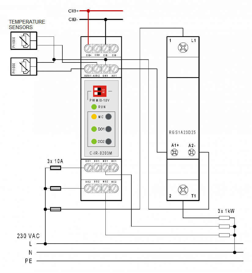 For continuous power control to resistive load, eg heating cartridges of storage tank on TV we can use SSR modules, eg for outputs up to approx. 3 kW module RGS1A23D25, controlled by PWM output of the system - in the example used module C-IR-0203M. The module allows you to switch 2 heating coils and control the third continuously with PWM output (thus obtaining continuous control in the range 0 ÷ 3 kW for 3x 1 kW coil) and simultaneously measure up to two temperatures - eg temperature in the battery tank needed for optimal TV temperature control.