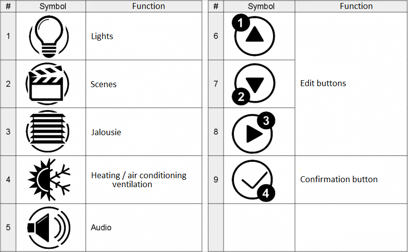 The ① - ⑤ buttons are used to enter the control menu (Lights, Scenes, Blinds, Heating / Air Conditioning, Ventilation and Audio), the ⑥ - ⑨ buttons are for editing. In the case of controlling lights, scenes and blinds, it is possible to display a maximum of 4 elements on the screen, in the case of a larger number, pressing the appropriate button ① - ③ again switches the tabs with the elements. After editing, the module automatically switches to the initial screen after 15 seconds