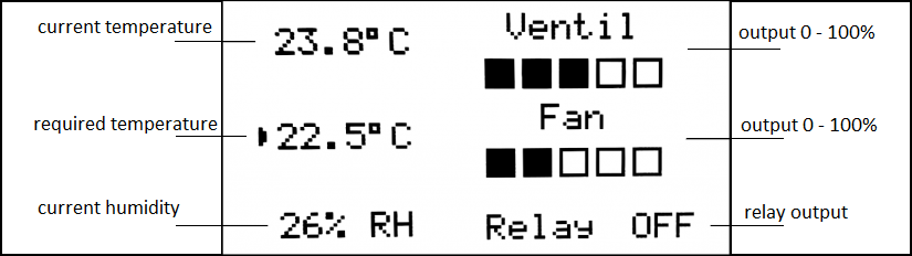 This function allows the setting of the required room temperature, 2 general outputs in the range 0 - 100% (fan, fan coil, etc. in steps of 20%) and the relay output. The current temperature and humidity are displayed.