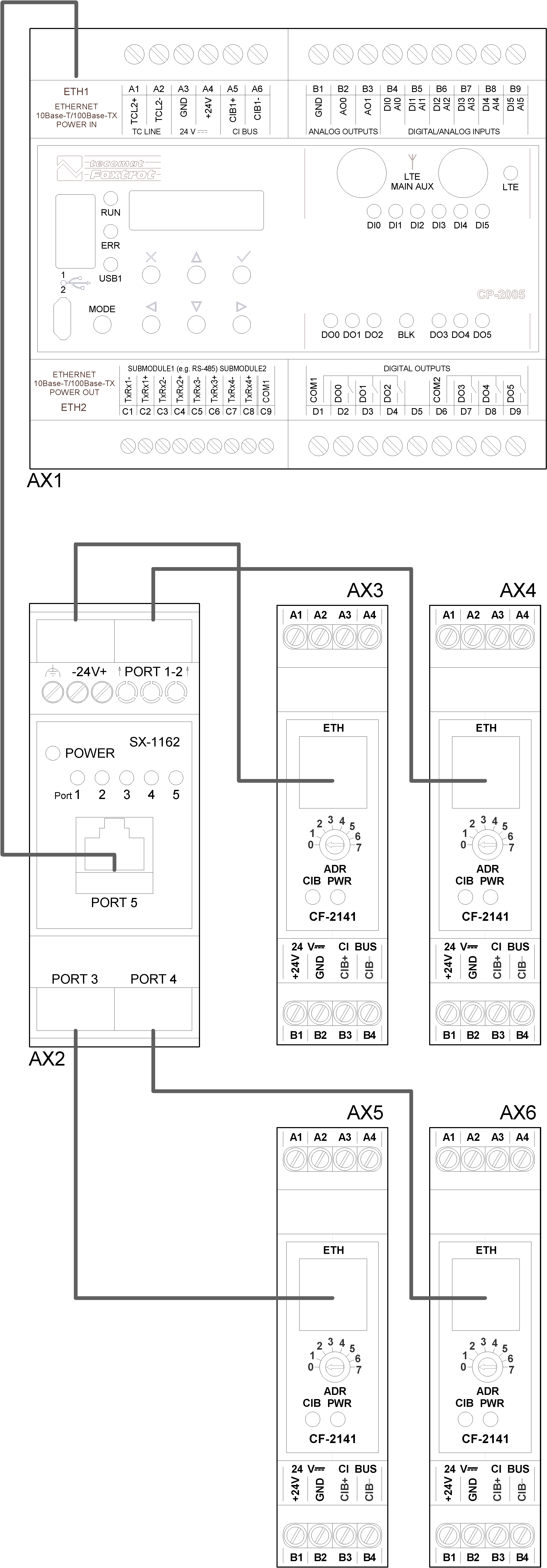 The example does not show the power connection. It depends on the location of individual CF-2141 (when placed in different cabinets, it is always necessary to use the power supply located at the CF-2141 module), ev. on the total power consumption (if several CF-2141 together with CP-2xxx and SX-1162 are in one switchboard, it is possible to supply them from one common source).