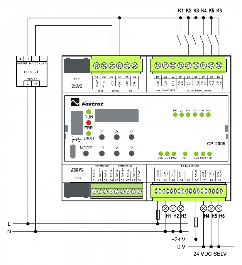 The basic module CP-2005 is the basic module of the Foxtrot 2 control system. It is in standard version on DIN rail, in 6M cover (for dimensions of box see chapter 13.2.2 6M mechanics on DIN rail), equipped with four removable terminal blocks. It is also equipped with two independent Ethernet interfaces, one USB device interface for connecting the master system and one USB host interface for connecting external memory (USB Flash Drive).