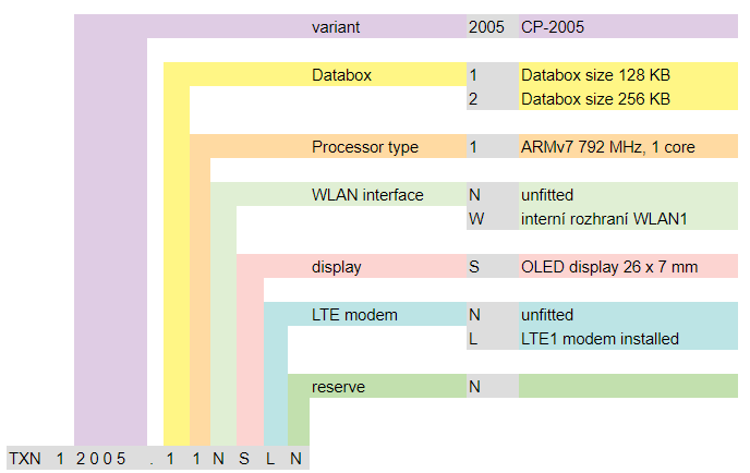 The basic module CP-2005 is supplied in several variants distinguished by a combination of numbers and characters following the dot in the order number (eg TXN 120 05.11NSNN). In this way, a combination of different memory sizes for the DataBox, with optional WLAN1 and LTE1 interfaces, and a different integrated display size are defined. The principle of marking individual variants is given in Tab. .x1