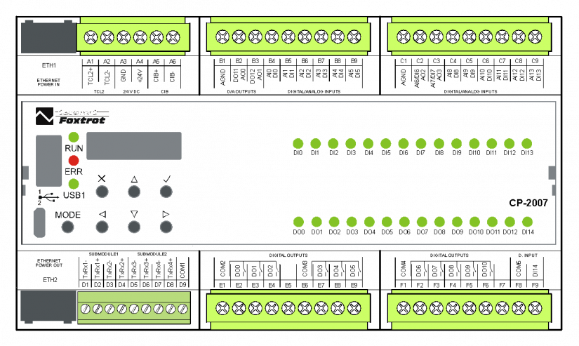 The basic module CP-2007 is the basic module of the Foxtrot control system of the second generation. It is in standard version on DIN rail, in 9M cover (for dimensions of box see chapter 13.2.1 9M mechanika na DIN lištu), it is equipped with six removable terminal blocks.