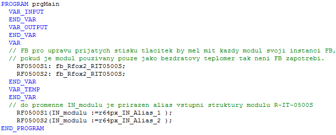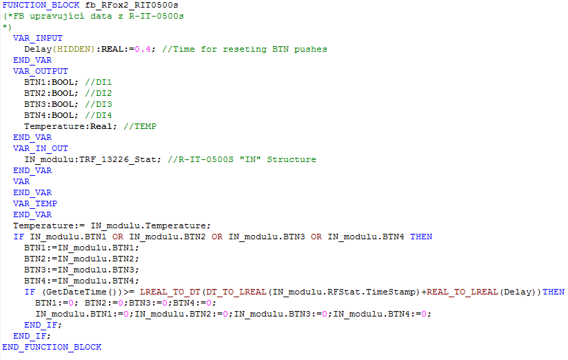 Before using the digital inputs, in addition to configuring the module in the I / O configurator, it is necessary to add a program to reset the variable carrying information about the state of the button. As mentioned above, the module only sends a log. 1 when DI is activated. After a single activation of the button connected to DI, the value of the corresponding variable would remain set to 1. The enclosed function block fb_RFox2_RIT0500S.ST “solves this phenomenon. After receiving the log. 1 sets the corresponding variable back to zero. When DI is activated, it is therefore a variable in log. 1, when DI is inactive, it is in log. 0. In the program, this function block must be called at the beginning of the cycle or before evaluating the state of the keys in order to read the current values.