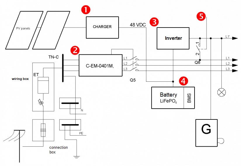 Hybrid connection with connected PV modules via DC / DC battery charger and DC / AC inverter connected to the battery. Phase L1 is led to the non-backed up part of the electrical installation, the output of the inverter L1 'is connected to the backed up appliances in the electrical installation. This solution enables an island mode, where the L1 'phase is backed up according to the output power of the inverter. During normal operation, it is connected to the L1 phase by means of a bridging relay ❺ phase L1 'and allows to supply the full consumption of the house, at the same time it is possible to control the inverter so that as much energy from PV panels (with limited inverter power) is consumed in the house. In the event of a grid failure, it is necessary to limit consumption according to the maximum power of the inverter - which is one of the tasks of the control system. This solution does not allow charging the batteries from the mains.