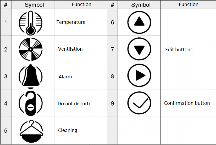 The module is controlled by 9 capacitive buttons (Table 2), for which short and long presses are detected. The long press delay is adjustable in the module initialization as well as the audible response to the press. The buttons are further marked ① - ⑨ in the documentation.
